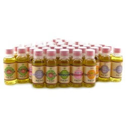 The 100% vegan formula is packed with completely natural ingredients, you’ll be able to recognize each one- making up the silky, non-greasy body treat is simple almond, apricot, grape seed, sesame and hemp seed oils combined with vitamin E and rosemary along with phthalate free fragrance, Anyone with sensitive skin will appreciate the lack of petroleum and parabens, and as mentioned, this formula is 100% vegan. small, portable bottles are included, each containing 1 oz of Oil in assorted flavors.