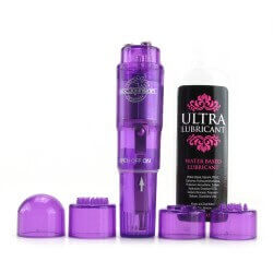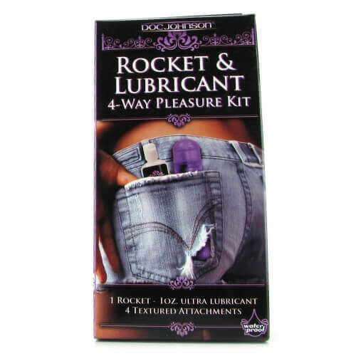 A handy little kit containing two pleasure essentials, the 4-Way Pleasure Kit combines a classic pocket rocket style vibrator with a 1 oz bottle of Ultra 18. The vibe has a the familiar, petite, user friendly shape that’s perfect for clitoral stimulation and lavishing pinpoint sensation on your other external sweet spots. On its own it’s already pretty fantastic, with the signature smooth, raised triple beaded head, but to make things even better, there are 4 interchangeable caps included, which completely change the feel. From a smooth, rounded shape to three levels of raised texture, you’ll be able to easily customize just how much intensity you’re in the mood for. Add a drop or two of the lube to help things slide smoothly, and enjoy. Takes 1 AA battery (sold separately). Waterproof.