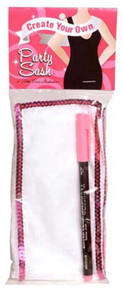The Create your own Party Sash allows you to write your own personal messages such as “Buy me a Drink” or “Single and Looking” or perhaps just your phone #. Sash comes complete with pink colored fabric marker. Sash is 5-ft long to fit most partygoers. Safety pin not included.