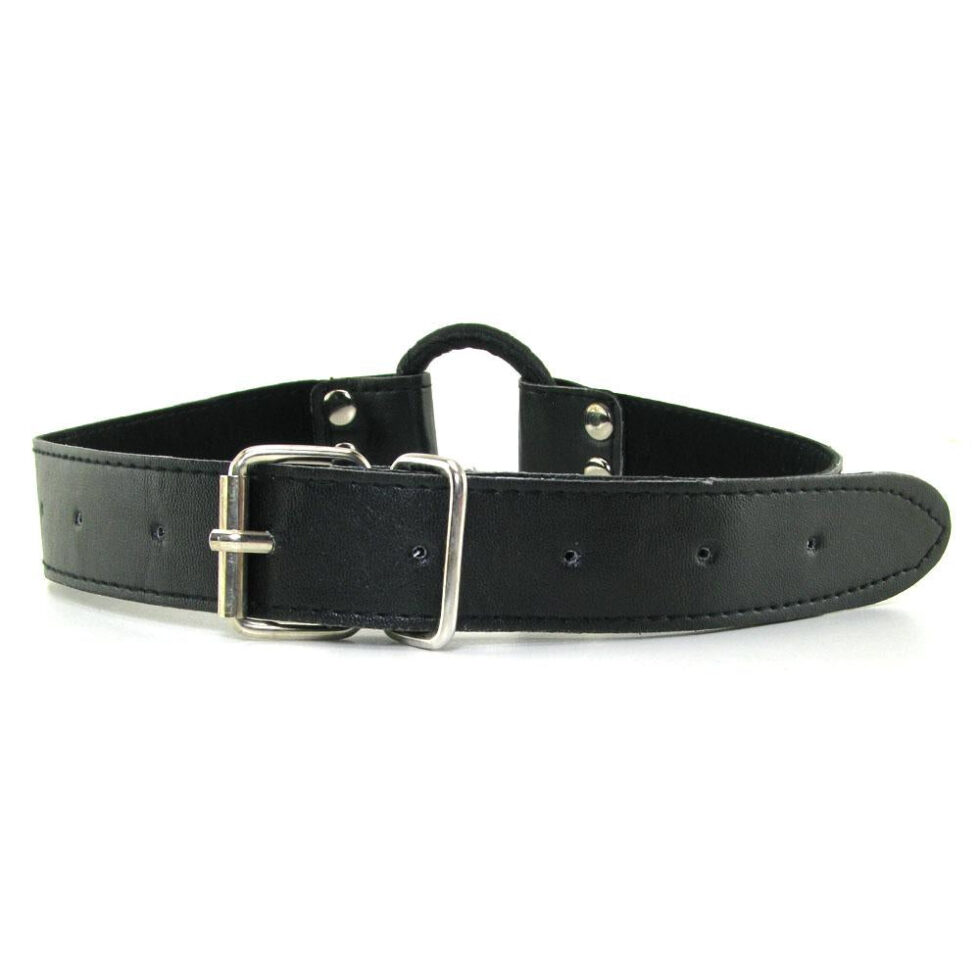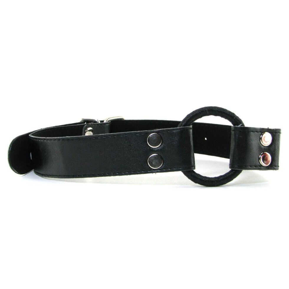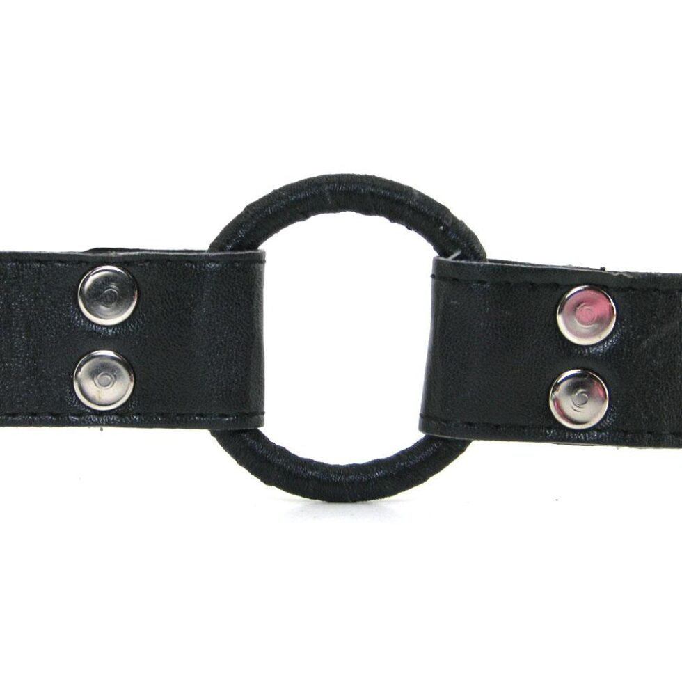 Made to play hard, the leather-look PVC strapped gag is firm and unyielding in a classic O-ring style, an ultra firm, ribbon-wrapped 1 3/4 inch (4.4cm) metal circle keeps the mouth open and ready while impeding speech. Softly lined, the straps wrap securely around the head with lots of room for adjustment, sturdy metal hardware and riveted construction definitely defies escape. Fits most.