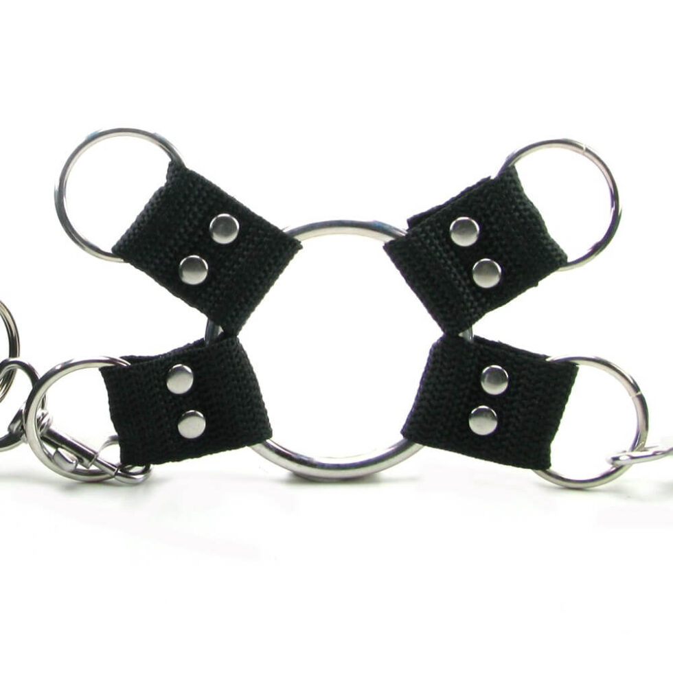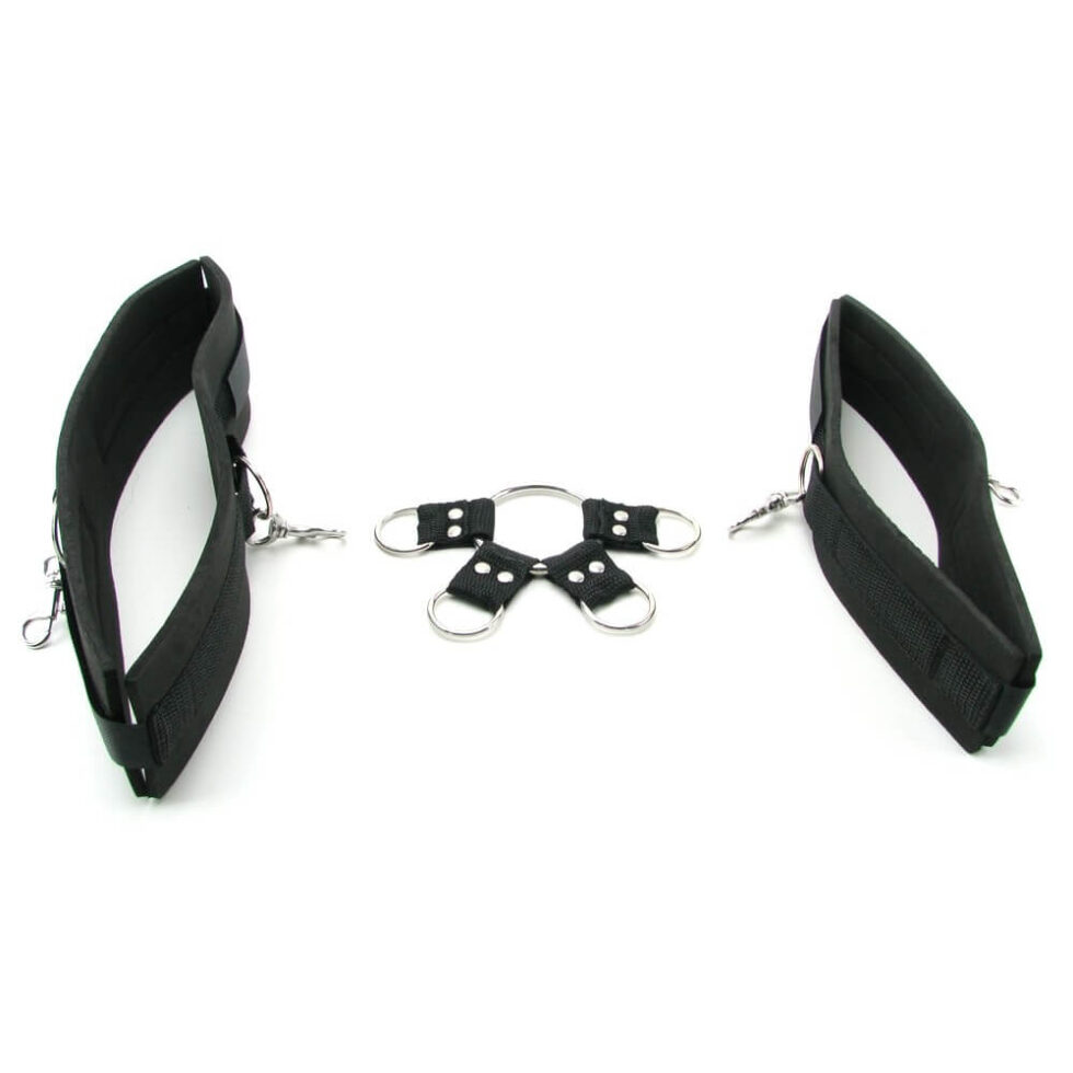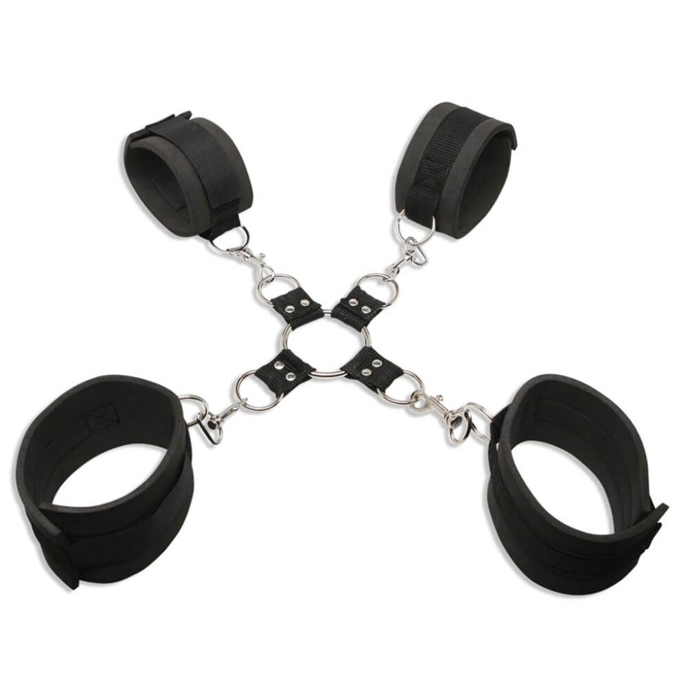 Includes Neoprene ankle cuffs, Neoprene wrist cuffs, Metal hogtie, Satin love mask