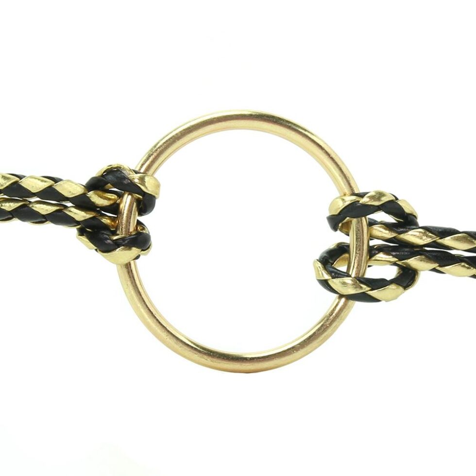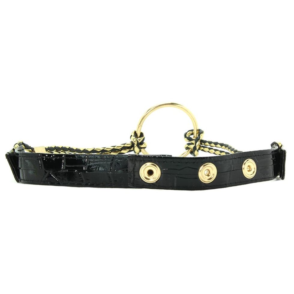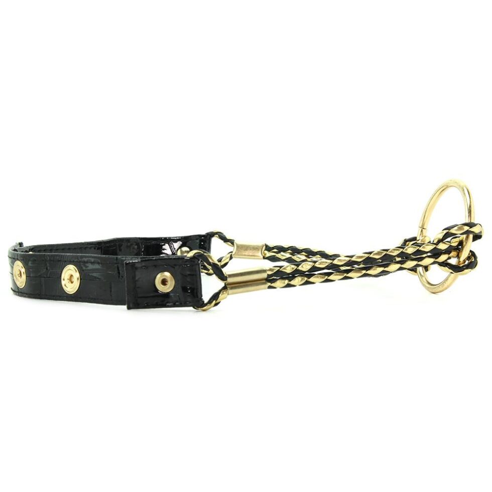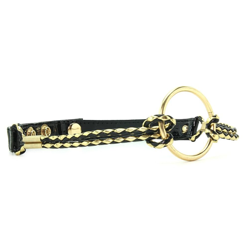 Easily and comfortably adjusting to fit most head sizes, this pretty braided bdsm staple is perfect for him or her, and is, as all the pieces in this deviously decadent collection, comprised of high quality materials, namely supple faux leather and non-tarnishing, nickel free alloys. The metal O ring in shiny gold hued metal is approximately 1.5 inches (3.8cm) in diameter. Spot clean.