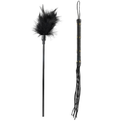 A feather tickler to tease and please offers another softer side to the Set, contrasted by a classic cat-o-nine-tails whip that packs an exciting sting when wielded just right.