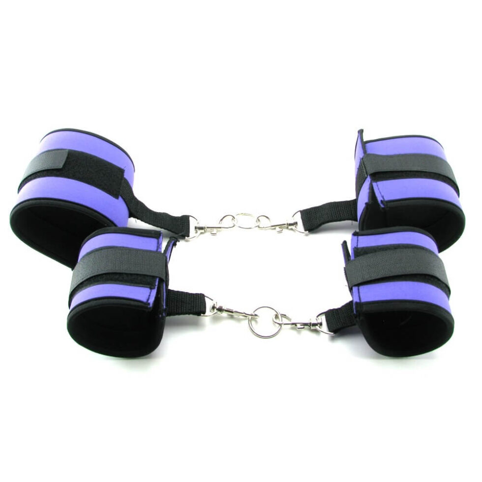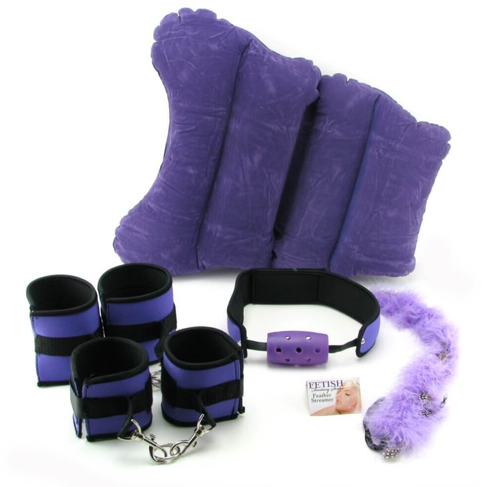 The comfortable neoprene wrist and ankle cuff set consists of 4 pieces, 2 wrist and two ankle, which can be clipped together or attached over the bed frame or other furniture to keep your object of desire right where you want them. To help out with adventurous positioning and increased comfort, an inflatable Love Cushion is included, with elevates the hips, supports the elbows, knees or head. A deluxe breathable ball gag is also included, letting you try out the sensation of being unable to speak while remaining safe and comfortable. To step things up even more, a soft satin mask is also included, letting you add some sensory deprivation into your sex adventures, it heightens the other senses, while blocking out light and creating anticipation of your next move. Indulge your Fetish Fantasies with this extra sexy collection.