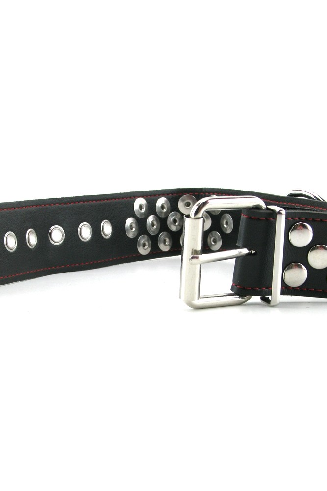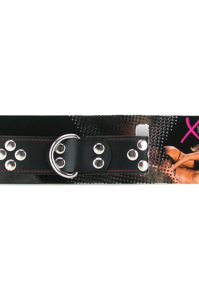 A thick, intensely studded collar with all the supple sexiness of leather, this must-have bondage accessory from X-Play was definitely made to play hard. Created from black leather with great looking red stitching, the Collar looks fantastic on your object of desire and fits snugly and securely with a hardy chrome colored buckle.