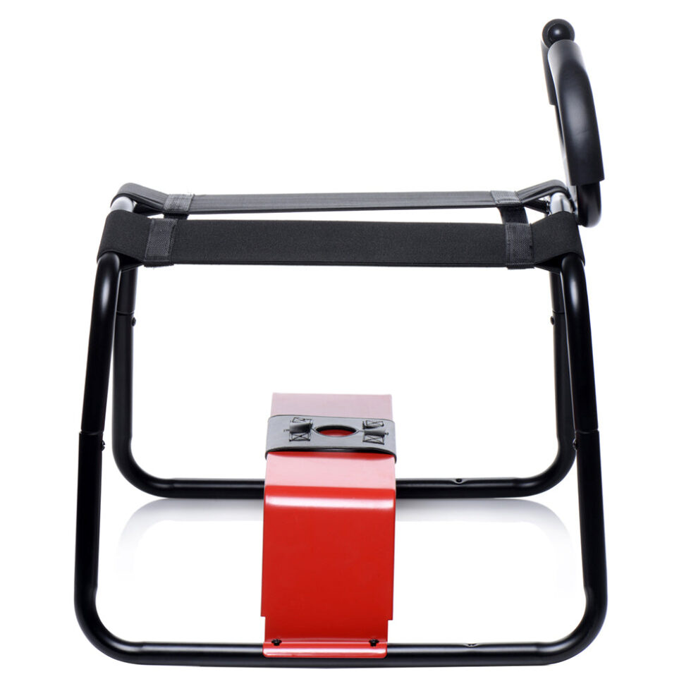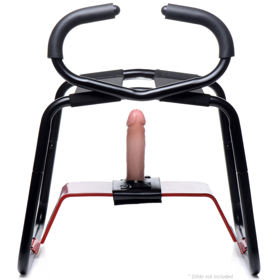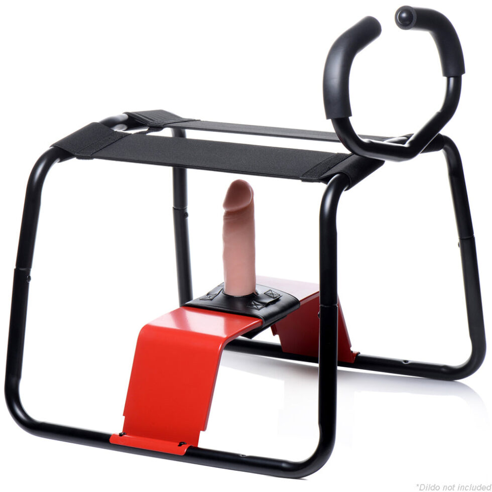 Also included is a red metal riser that can be used to steady any suction-based dildo, vibe or probe of choice – you can also use an included harness to strap in any compatible penetrator. You can also take the riser out of the set-up equation entirely, leaving an open space for you or your partner to lay.