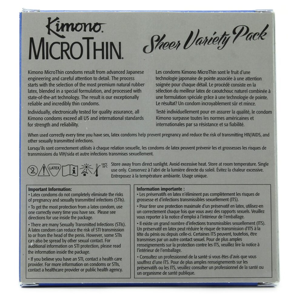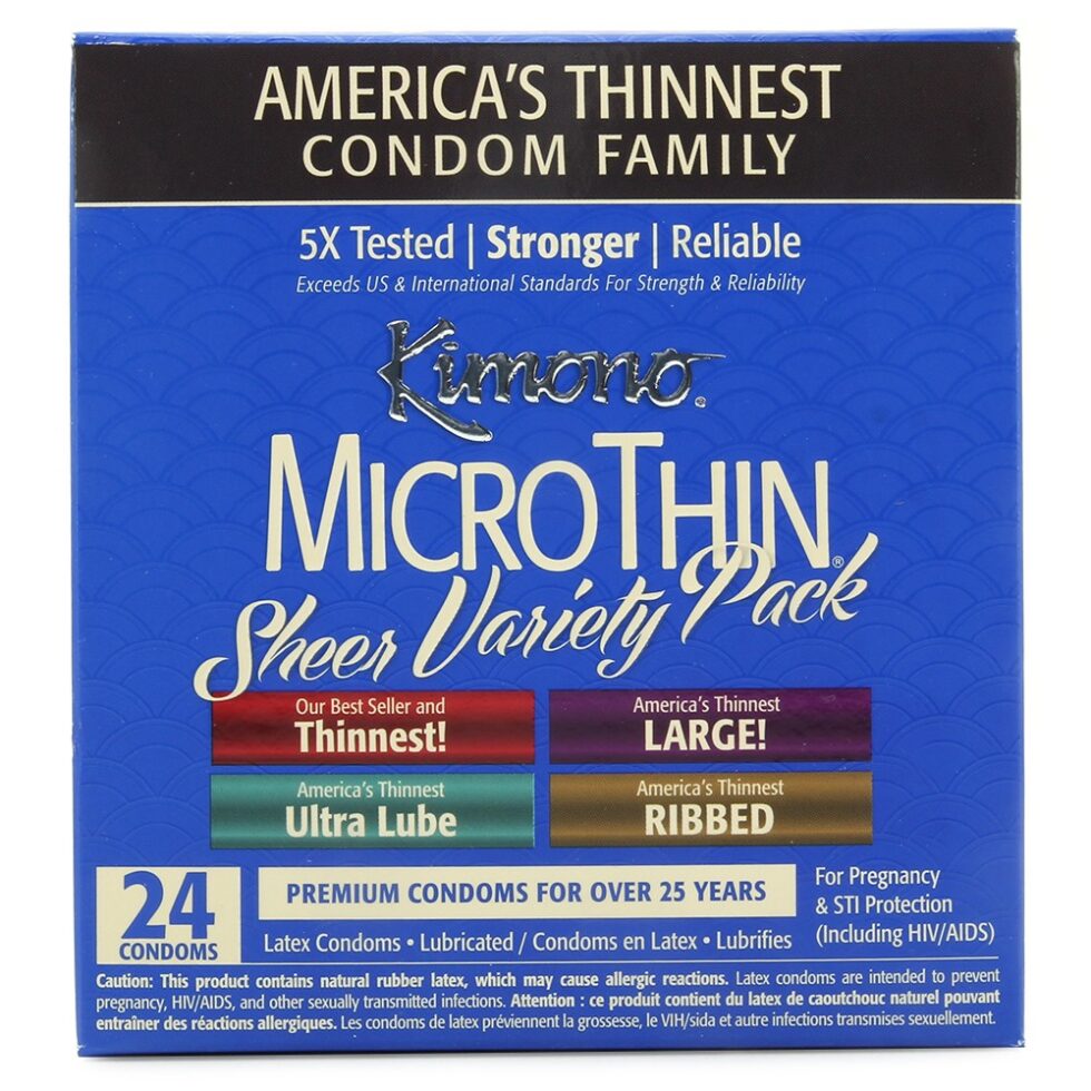 The MicroThin Sheer Variety Pack contains 4 styles of condom, each designed for sheer sensation and ultimate pleasure- significantly thinner than the competition, the MicroThin original, MicroThin Plus Aqua Lube, MicroThin Ribbed + Sensi-Dots and MicroThin Large all offer maximum transparency and superior sensitivity. All Kimono condoms exceed US and international standards for strength and reliability. They’re designed for the discriminating user, and are backed by 50 years of condom manufacturing experience.