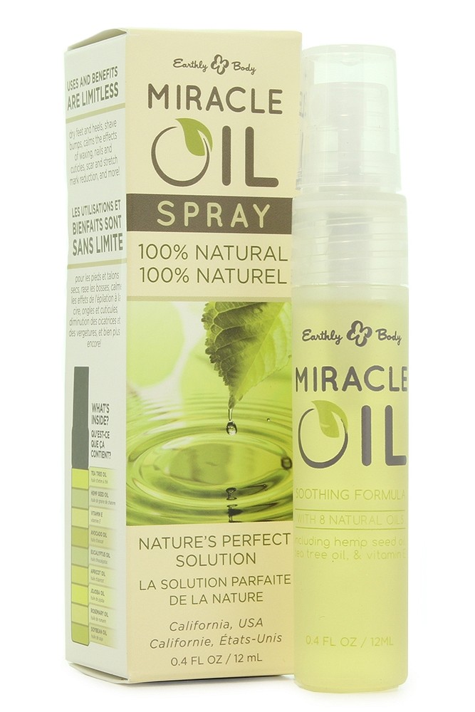 The Spray version of 100% natural Miracle Oil dispenses a gentle mist of beneficial botanicals over just about any external body area- use to moisturize and soothe even the driest skin on feet, heels and elbows or massage into nails and cuticles after removing polish.