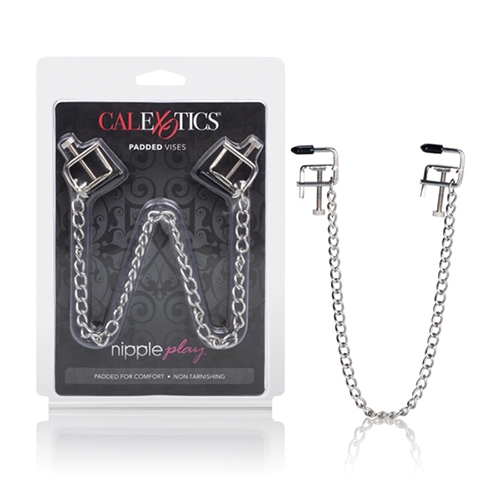 Includes 2 fully adjustable multi-use clamps Unique vise design Soft, comfortable pads Sturdy high-quality dual chain for added sensuality Non-tarnishing, nickel-free Nickel-Free Iron (chains, clamps) Phthalate-Free PVC (pads) 1” x 1.25”/2.5 cm x 3.25 cm (each clamp) 14.75”/37.5 cm (overall length)