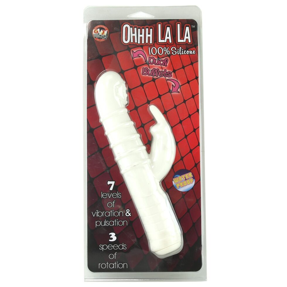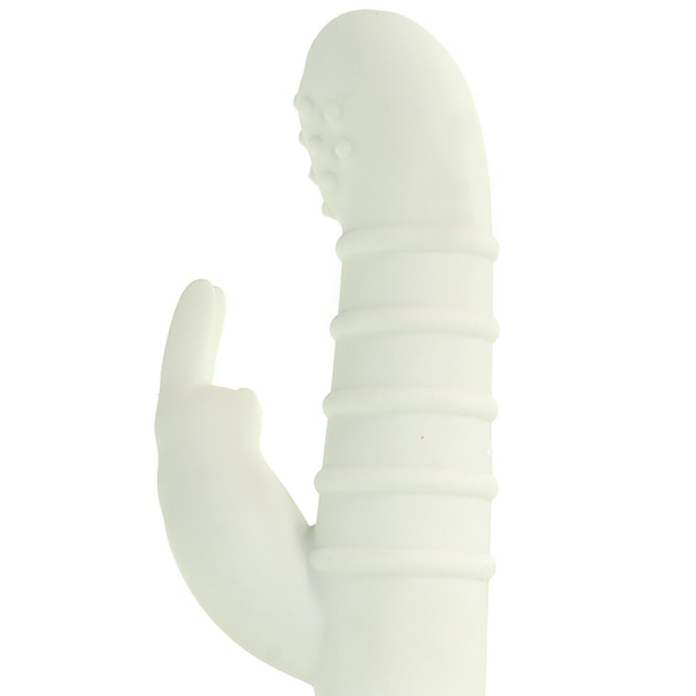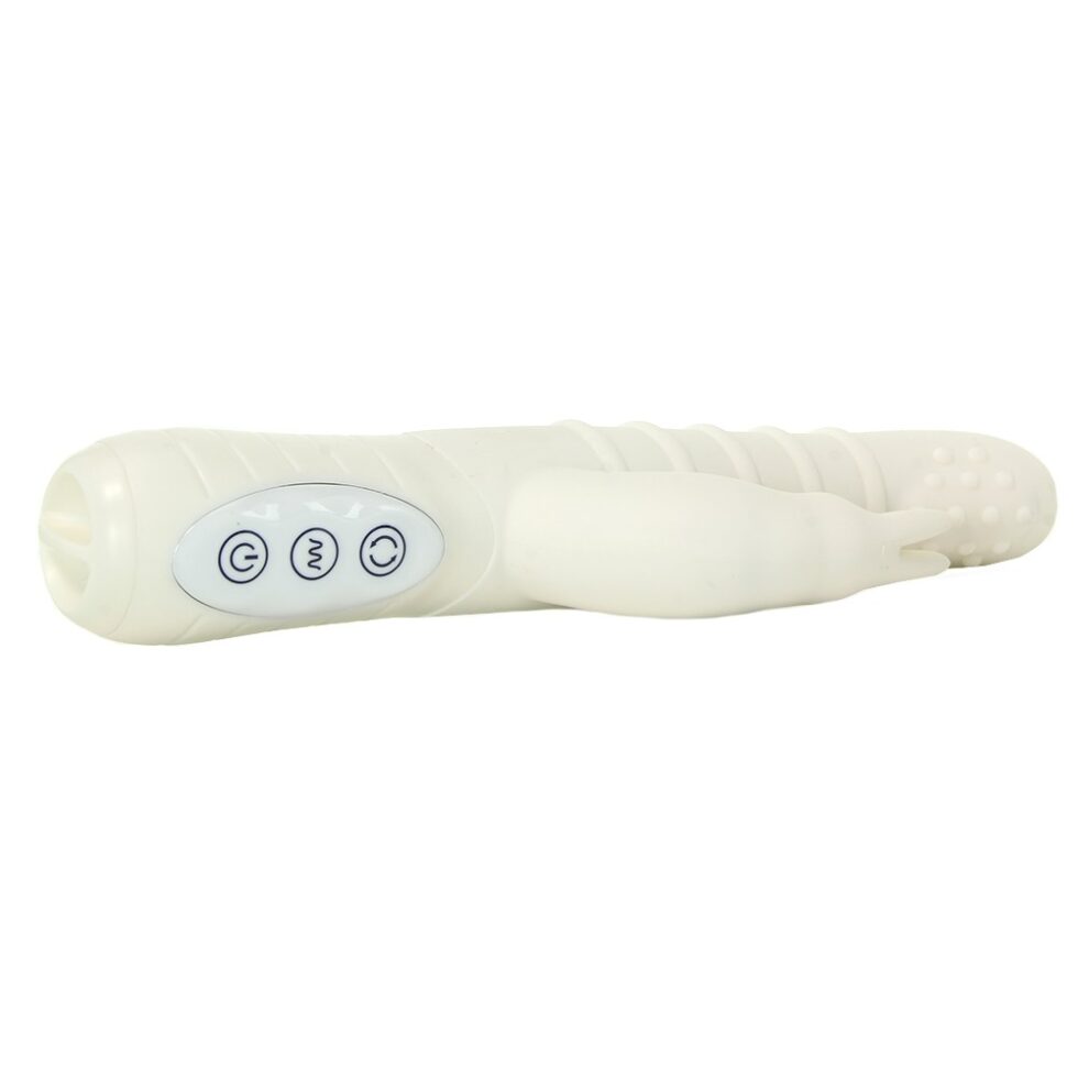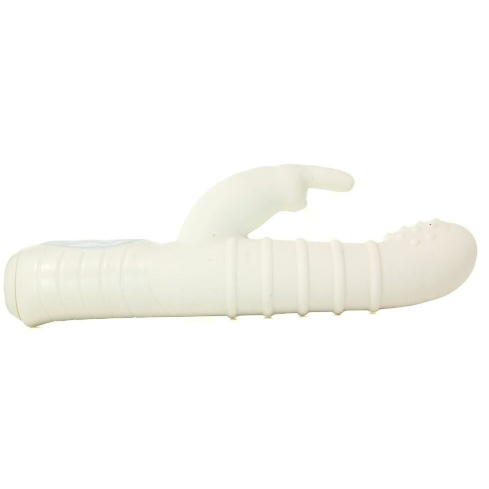 Making good use of a classic crowd-pleasing design, the rabbit styling combines a thickly ribbed shaft with a nubby tip. Seeking out sensitive inner areas as it rotates at three speeds, the shaft contains a dedicated motor, as does the bunny stimulator below. Seven modes of steady, pulsating and escalating vibration throbs through the bunny with the touch of a button- shaft rotation activates with another.