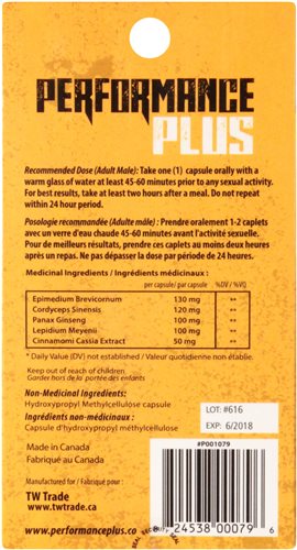 Performance Plus is all-natural and does not contain drugs that can leave you feeling flushed with a headache or with flu like symptoms like many other vitality drugs. There are no known side effects when taken as directed. Our fast acting clinically proven ingredients work with your body to enhance your peak performance. As with any natural supplement, you should check with your doctor before beginning use. Be sure to store your product in a dry place at room temperature. As with all supplements, keep out of the reach of children. Do not use product if seals are missing or broken. NPN80053999