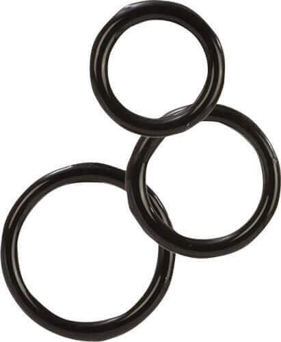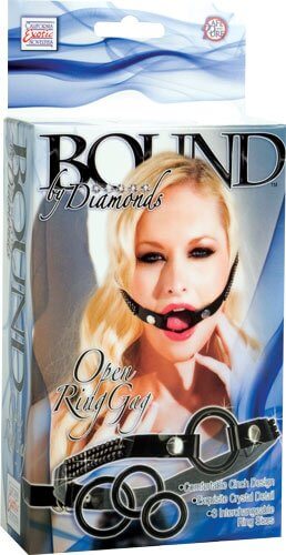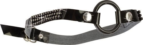 Fetish playwear of seductive black patent leather with lustrous white crystals and 3 interchangeable ring sizes: small (1.75″ / 4 cm), medium (2″ / 5 cm), large (2.25″ 6 cm).