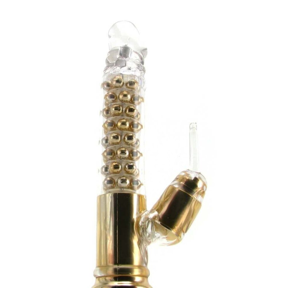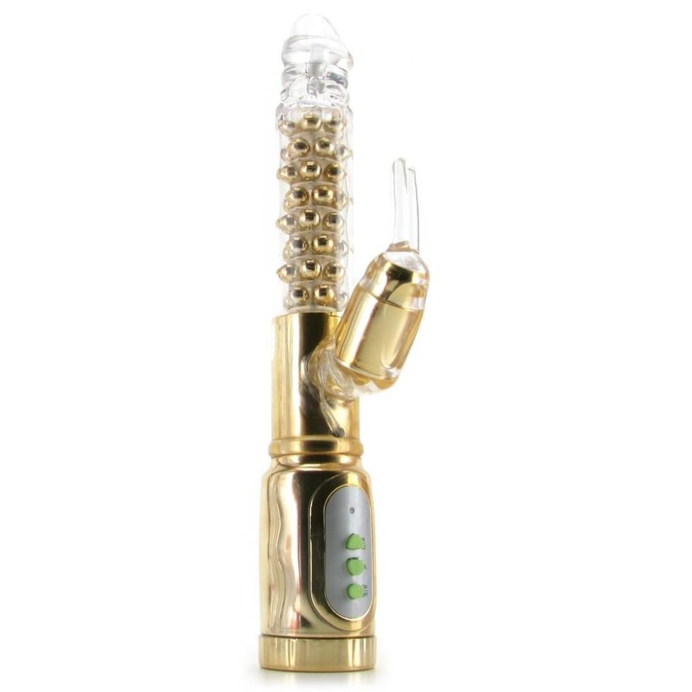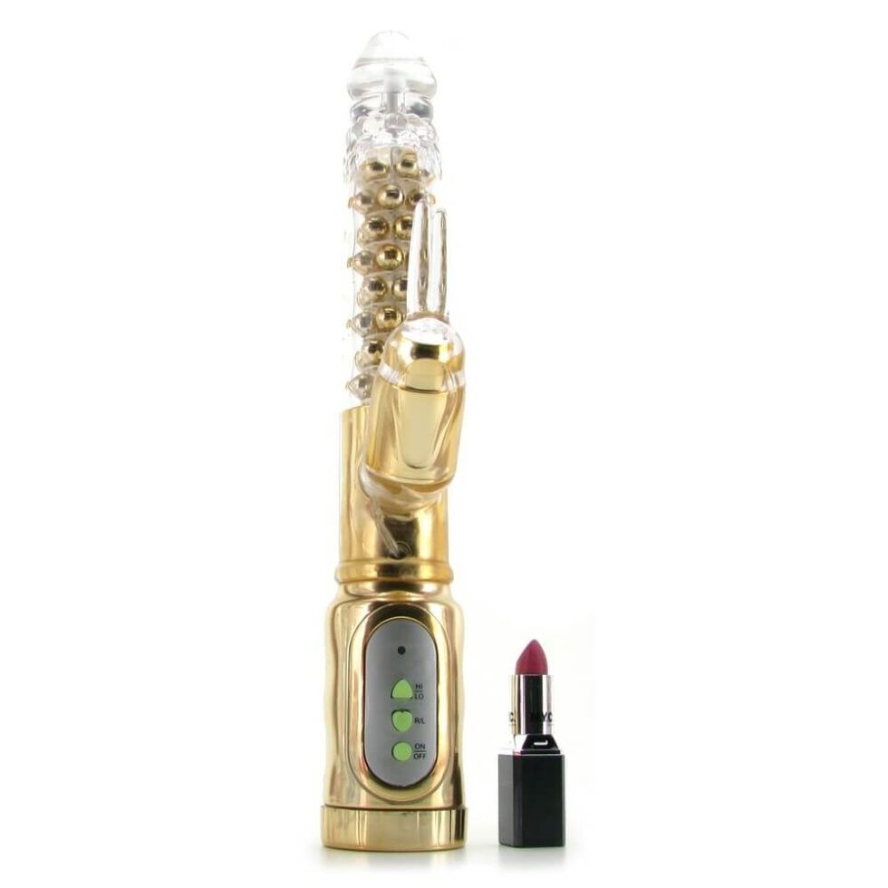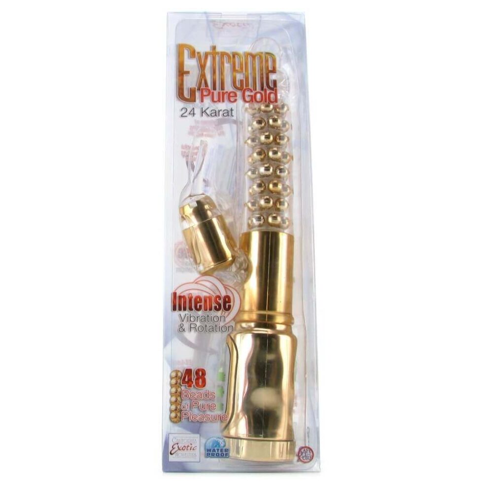 A luxurious vibe for knowing pleasure seekers, the 24 Karat is an above-average rabbit vibe from California Exotic’s Extreme Collection. Designed a little longer than the average rabbit, there’s a full 6 inches of penetration potential in the shaft, which is shaped semi-realistically and full of a total of 48 swirling, twirling pleasure beads. Combined with reverse rotation and 2 no-nonsense speeds, this long, lean, pleasure packed shaft is just one treat this vibe has to offer. Like any good rabbit vibe, there’s a powerful clit stimulator placed at the perfect angle; it has its own motor, ensuring lots of power where it matters most, and since it’s impressively flexible, you’ll be able to position it just right. Two long, soft fingers protrude from the tip of the stimulator, these vibrate along with the vibe to tickle and tease. Glow in the dark controls and an LED lit interface makes sure you’ll always be able to see your way to play, even in the dark; a hi/lo button and the reverse rotation button for the shaft are all you need to get the most out of the 24 Karat. Made from a hygienically superior, phthalate free elastomer, you’ll be able to play worry free, and since it’s thoroughly waterproof, you’ll be able to enjoy your gold in or out of the tub, shower or pool. Takes 4 x AA batteries (sold separately).