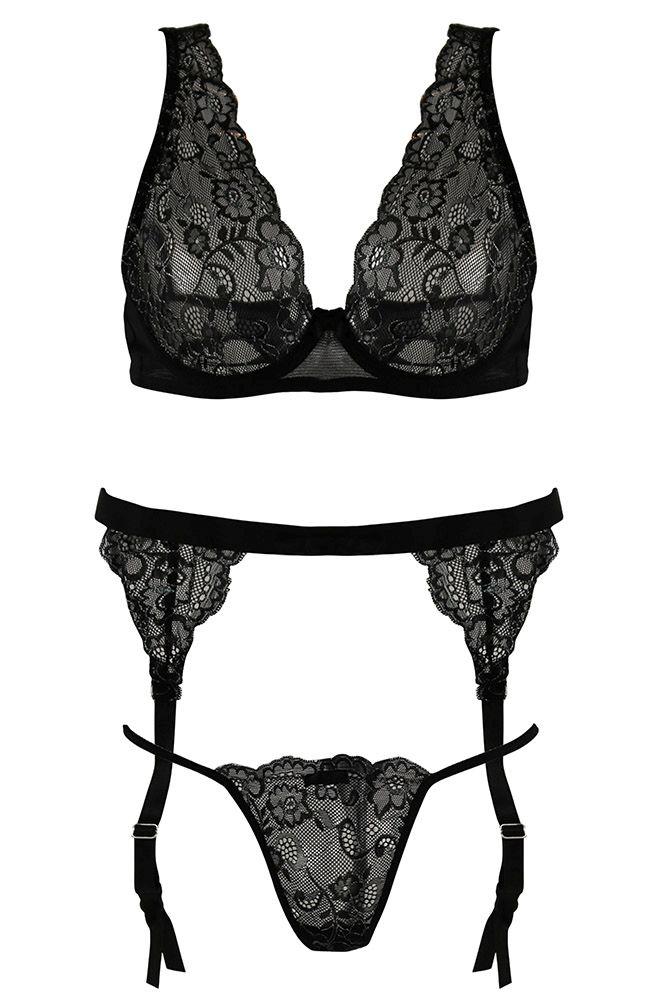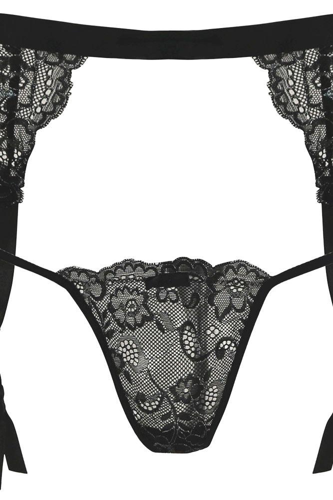 Lurex lace makes up the 3 Pc. Lux Lace Garter Set from Rene Rofe Lingerie’s Sexy collection, completely wrapping your sweetest spots in glimmering, black lace. Including a bra, g-string panty and a thigh-high garter belt, this timeless, three piece set is classically sexy. Attach your favorite pair of lace-topped thigh highs to complete this look. 90% nylon, 10% spandex. Hand wash.