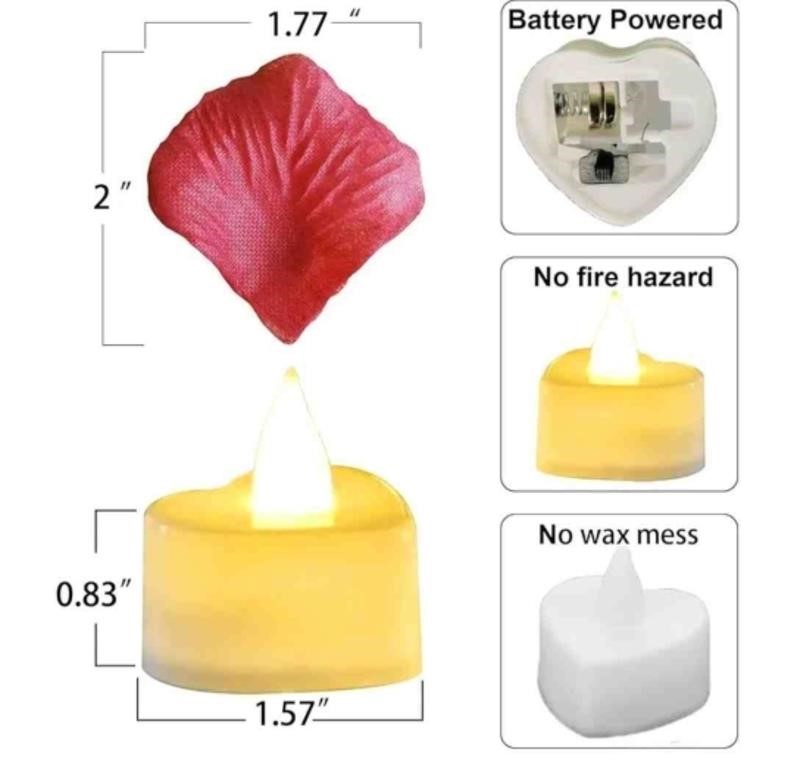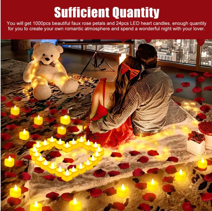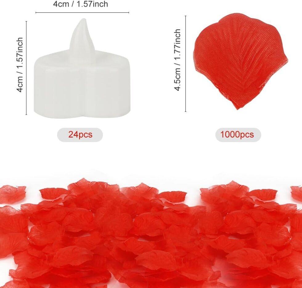 Includes: 1000 Red Silk Petals, 24 LED Tealight Candles