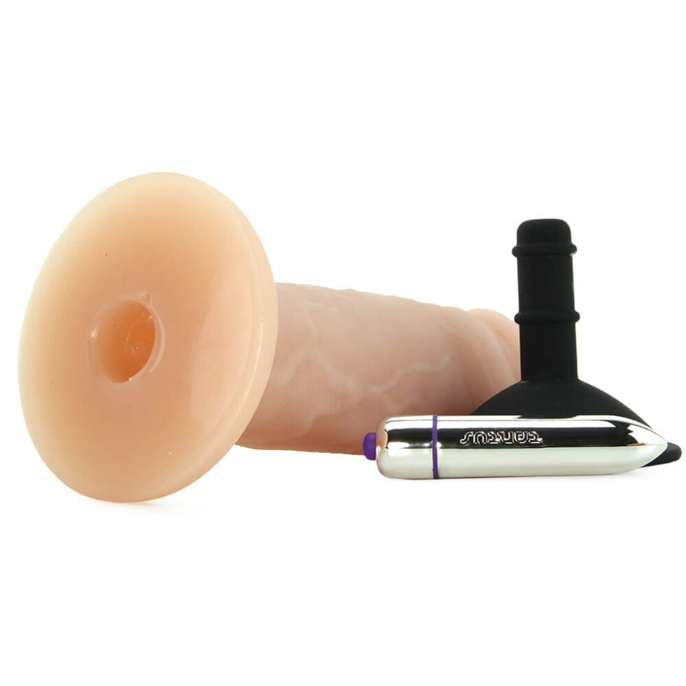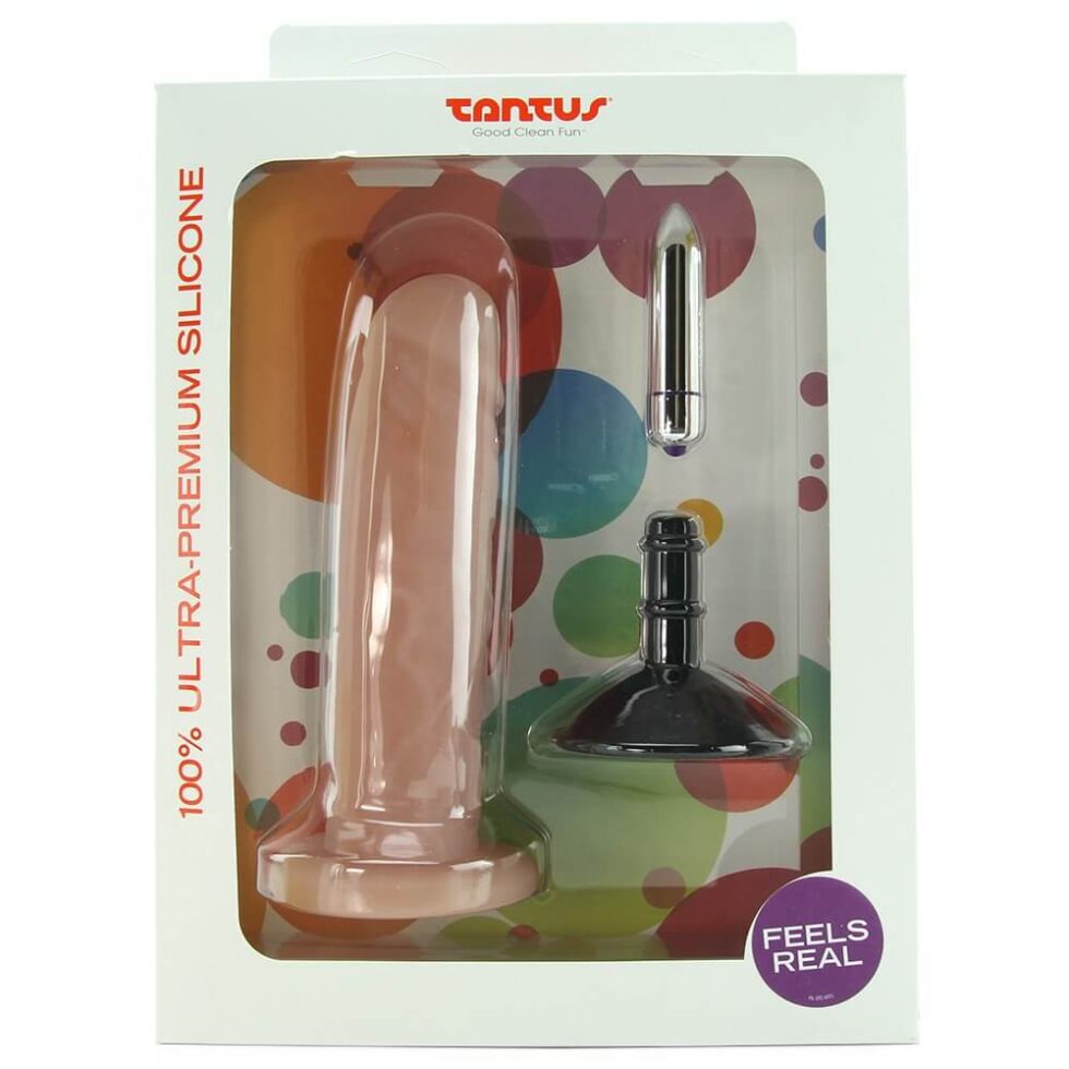 A sturdy suction cup add-on waits to be pressed through the bottom of the dildo. Holding steady agasint walls, windows, shower doors or counter tops, it makes for a perfectly position-able ride. Slipped though the same opening (with suction base removed), a classic Tantus bullet vibe sends shockwaves of vibration shuddering along the length.