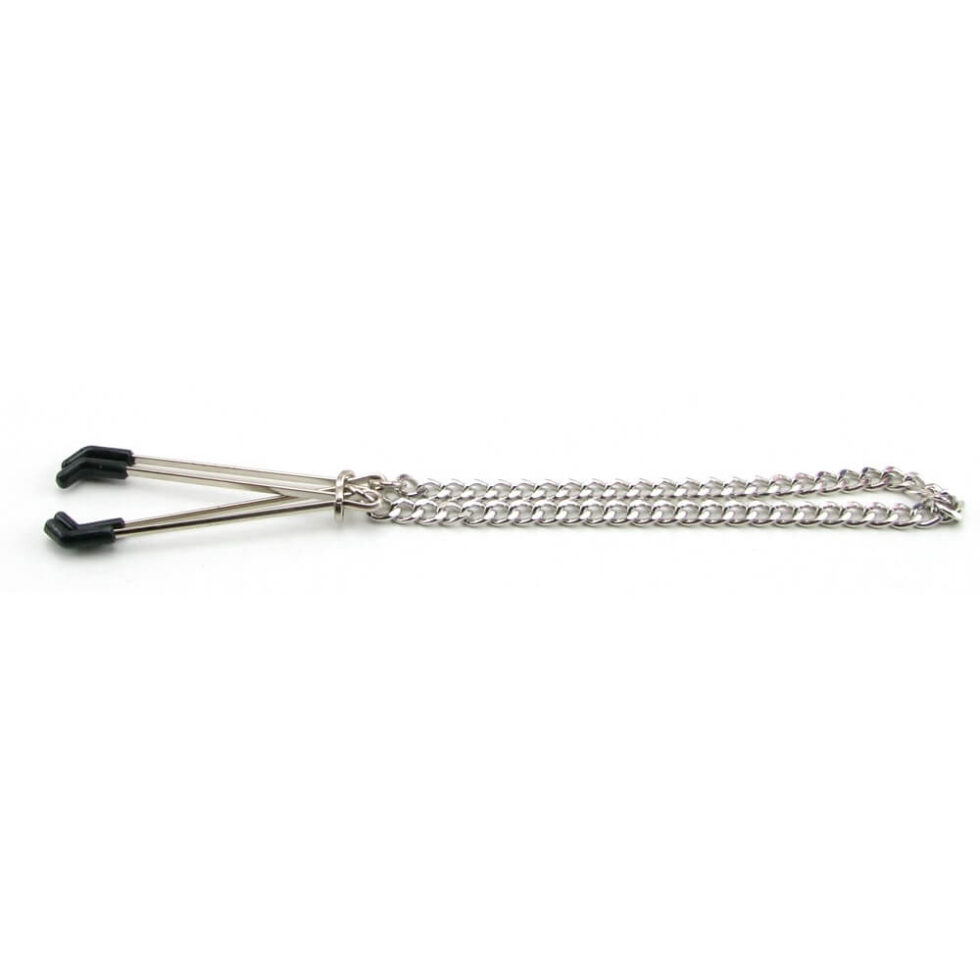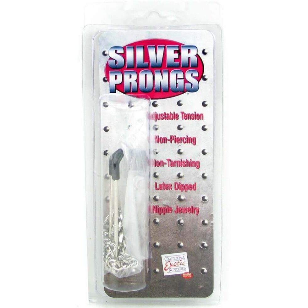 Add some kink to playtime with Silver Prongs Nipple Jewelry. The 2 3/4 inch silver prongs are attached by a silver chain, for a total length of 16 3/4. They’re non-piercing, non-tarnishing and latex dipped with adjustable tension. Enjoy!