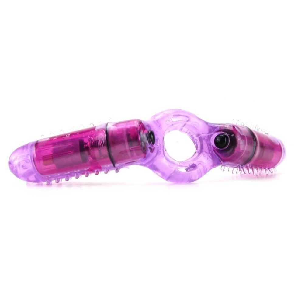 A strong, stretchy band fits around the base of the penis and around the testicles, helping to keep him hard and in control while also transferring the vibrating sensation. A vertical clit stimulator and identically shaped perineum/ anal tickler protrudes from the opposite end, both are covered in intense nubs and teasing fingers for tons of unique sensation.