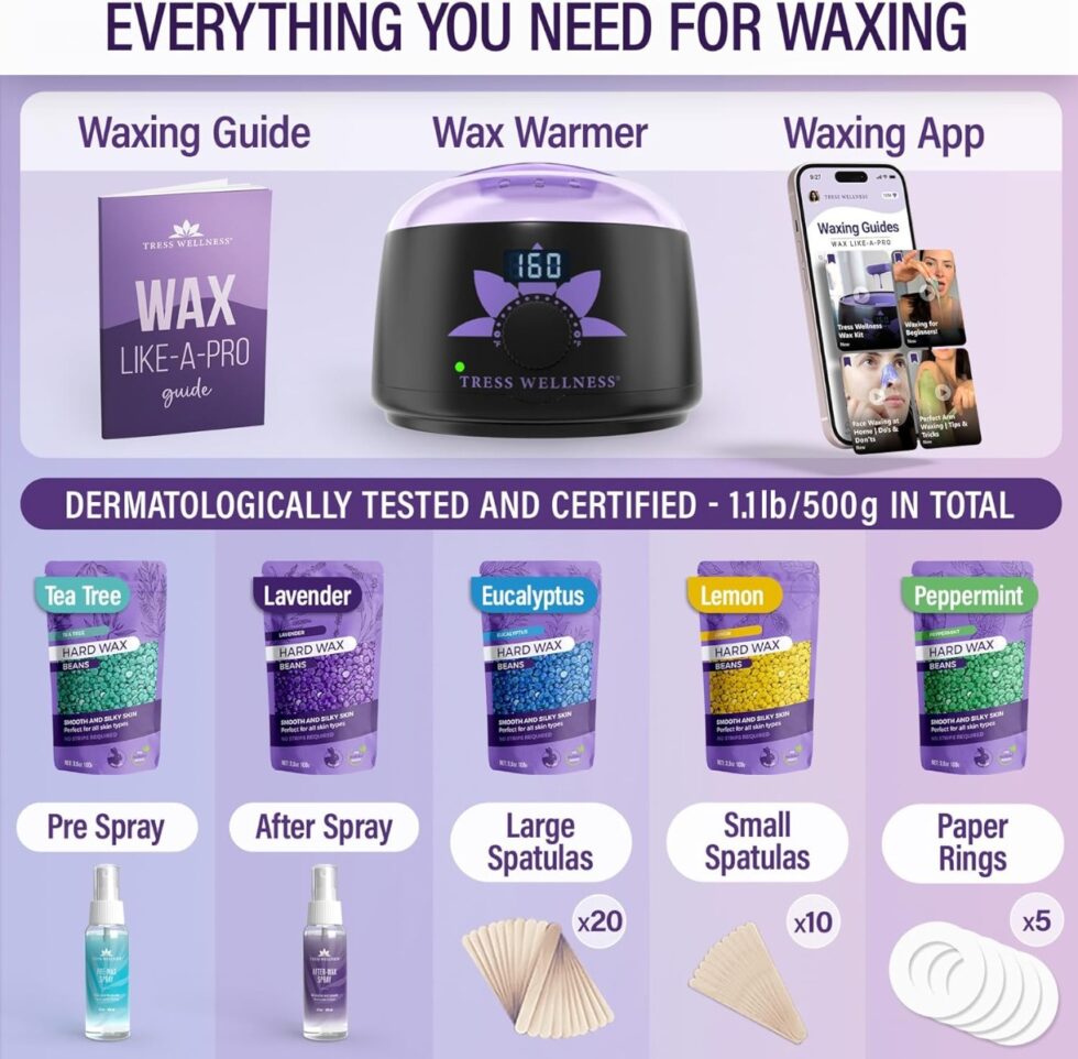 This all-in-one waxing kit includes a digital wax warmer, silicone bowl, 5 wax bead bags, pre & post wax sprays, spatulas, and everything you need for smooth, salon-quality results.